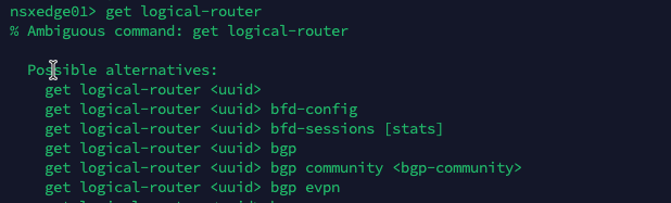 After the login I start with 'get logical-router' command to display available VRF IDs to change context to collect needed information. I did not fat-finger the command listed. In the past it always worked, because it seemed that 'get logical-router' and 'get logical-routers' were synonyms. In NSX9 they aren't anymore. Honestly, now it makes a lot more sense to me, but I am as lazy as anybody else, if I can save a single character I do ;-).